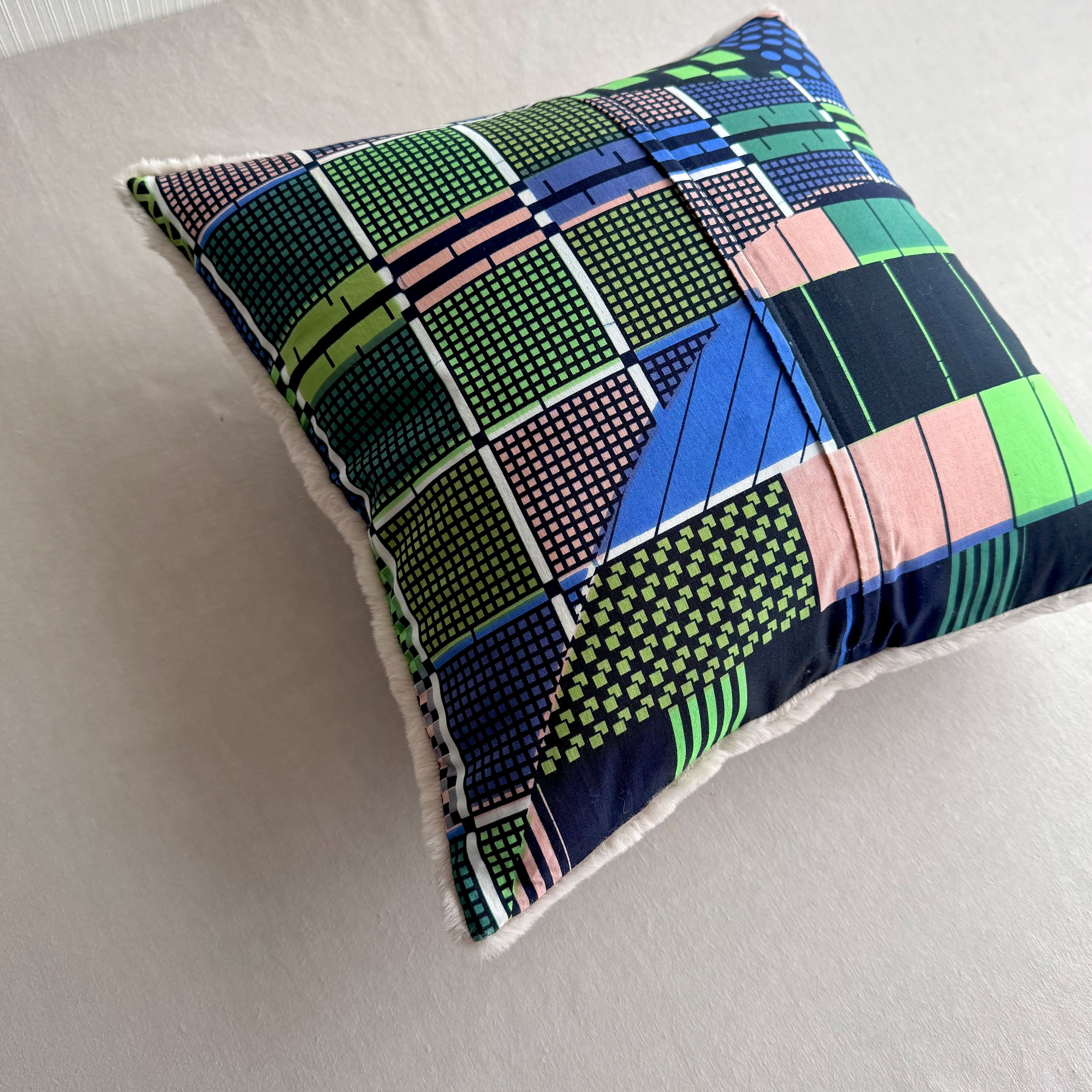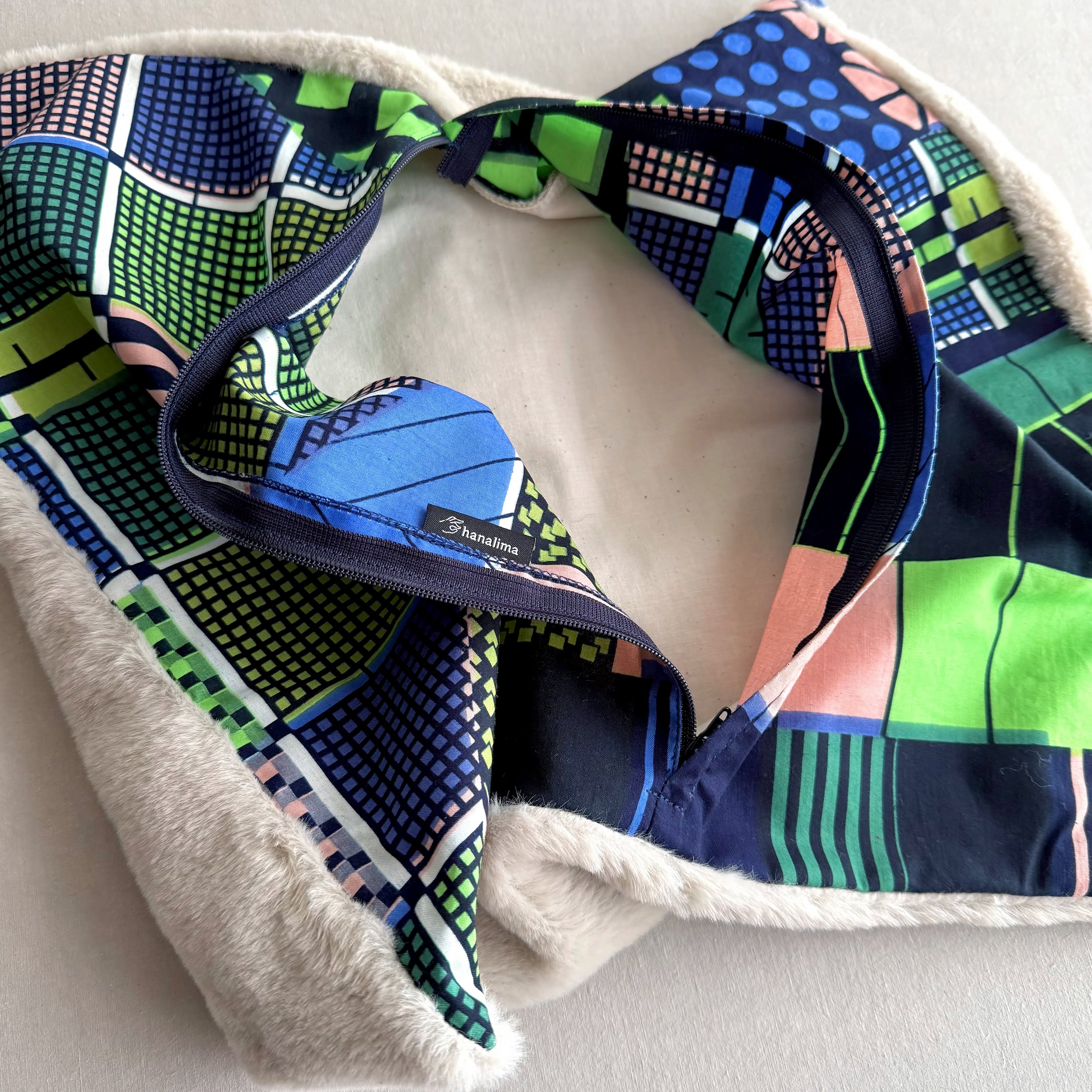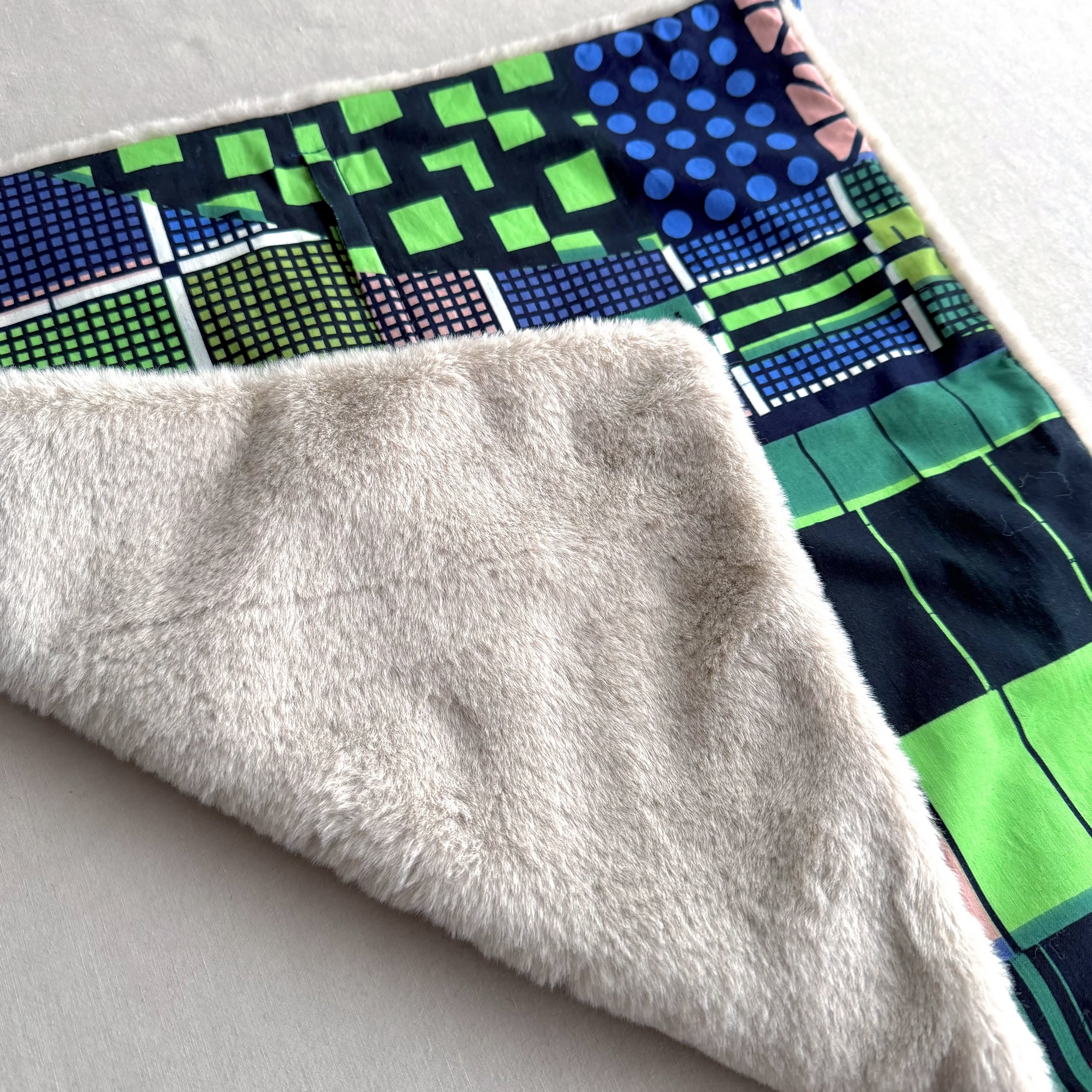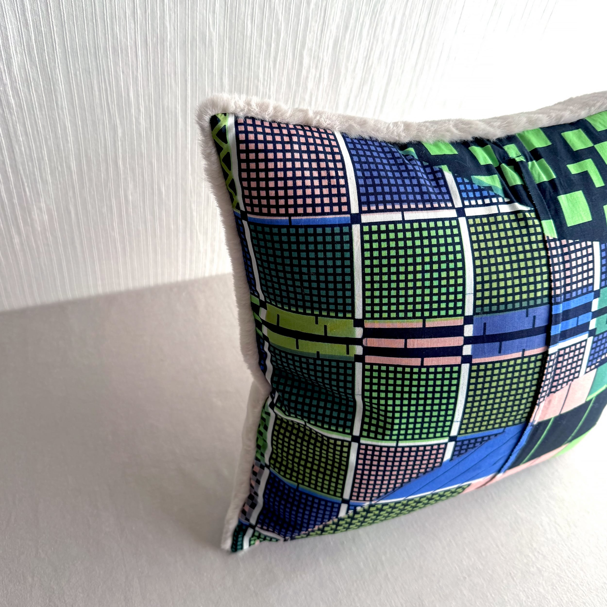 アフリカ布と手触りのいいラビットファー生地の組み合わせでお作りしたクッションカバー。