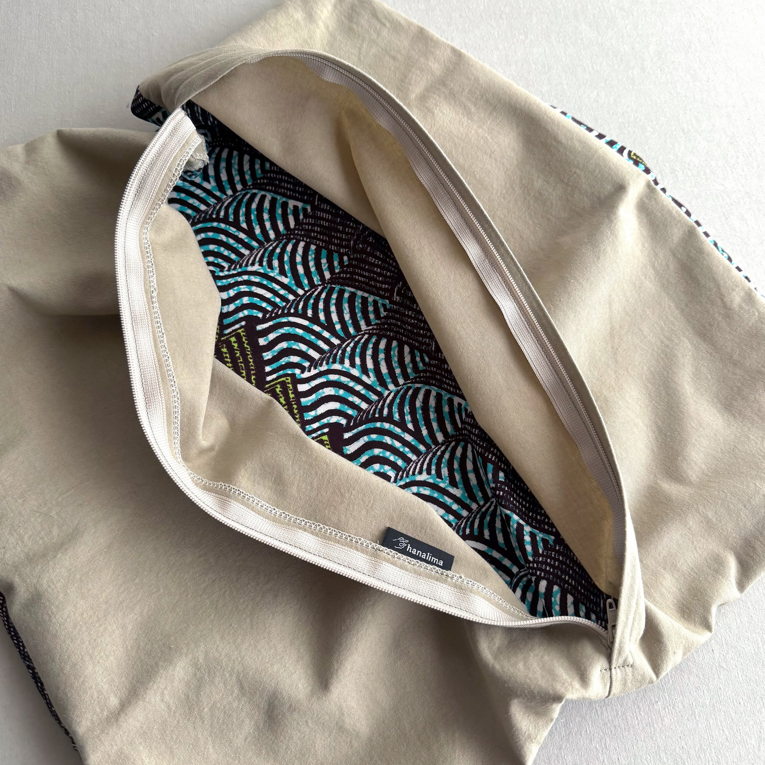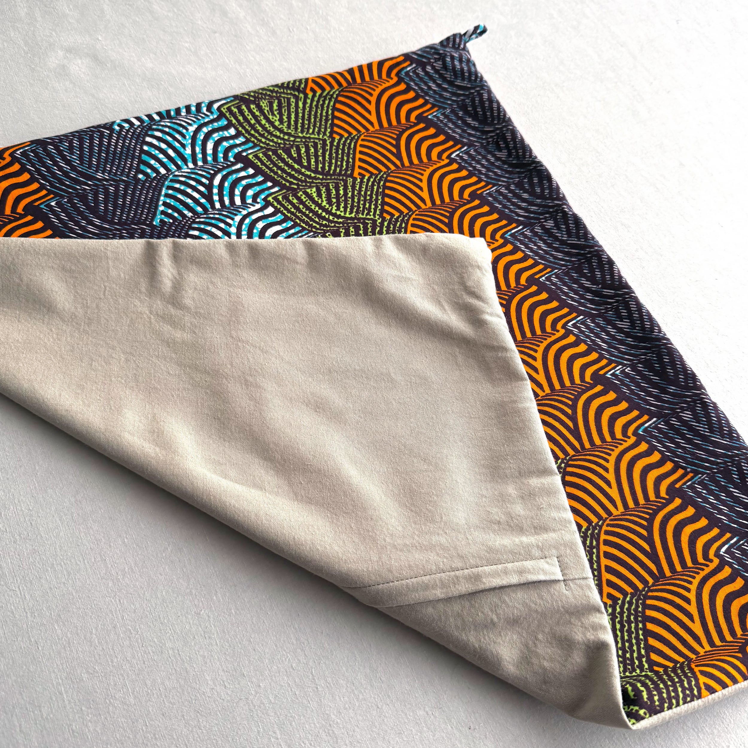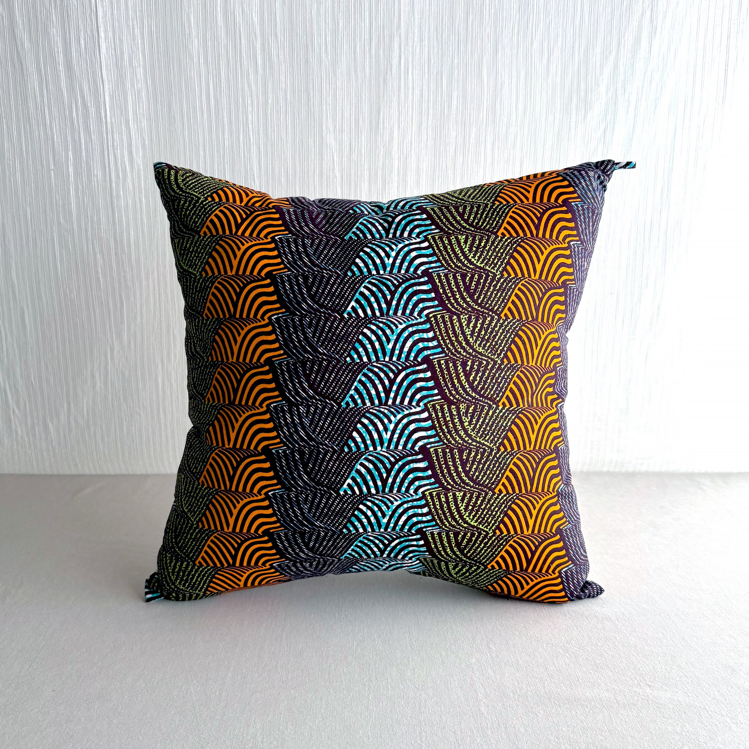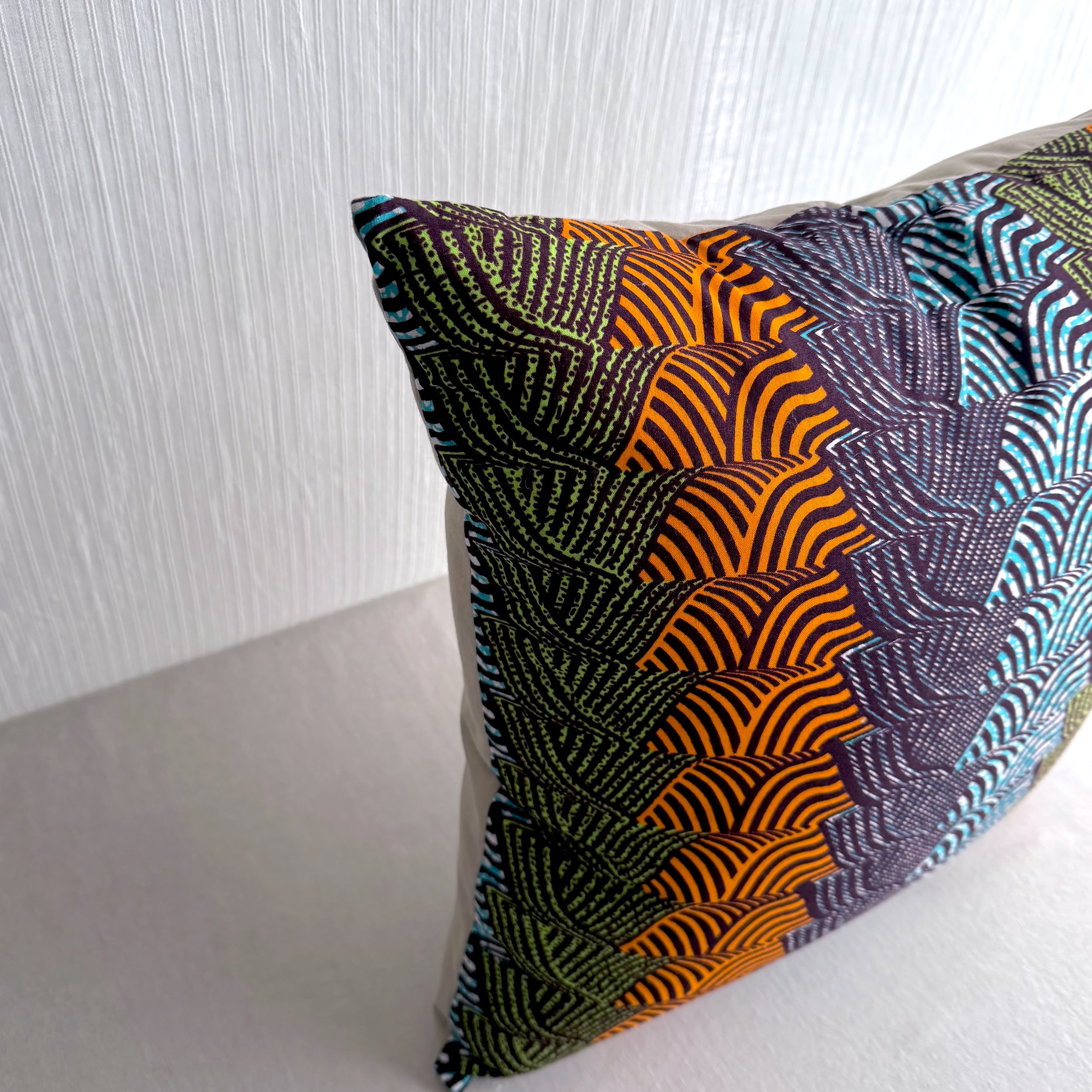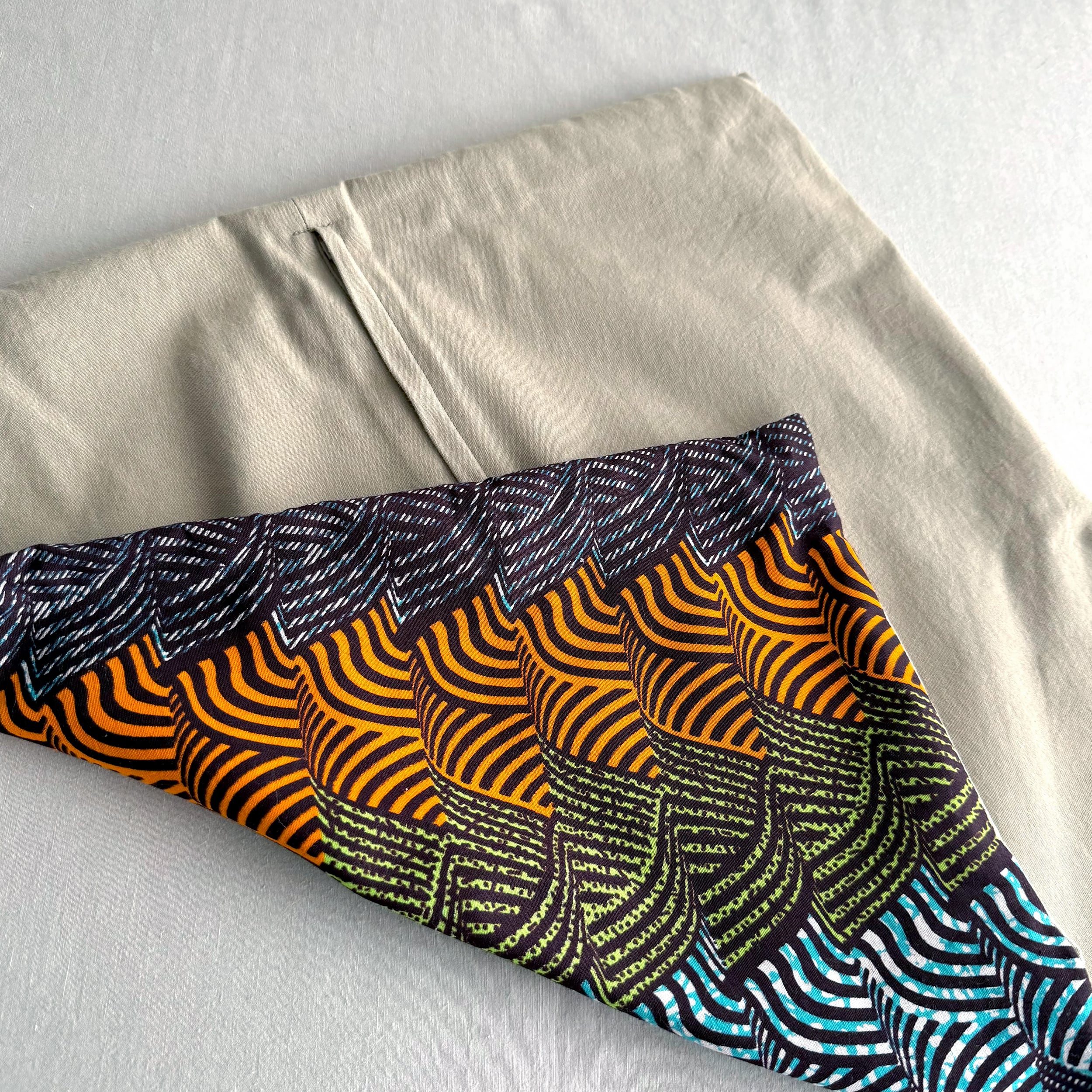 アフリカ布と無地の組み合わせでお作りしたクッションカバー。