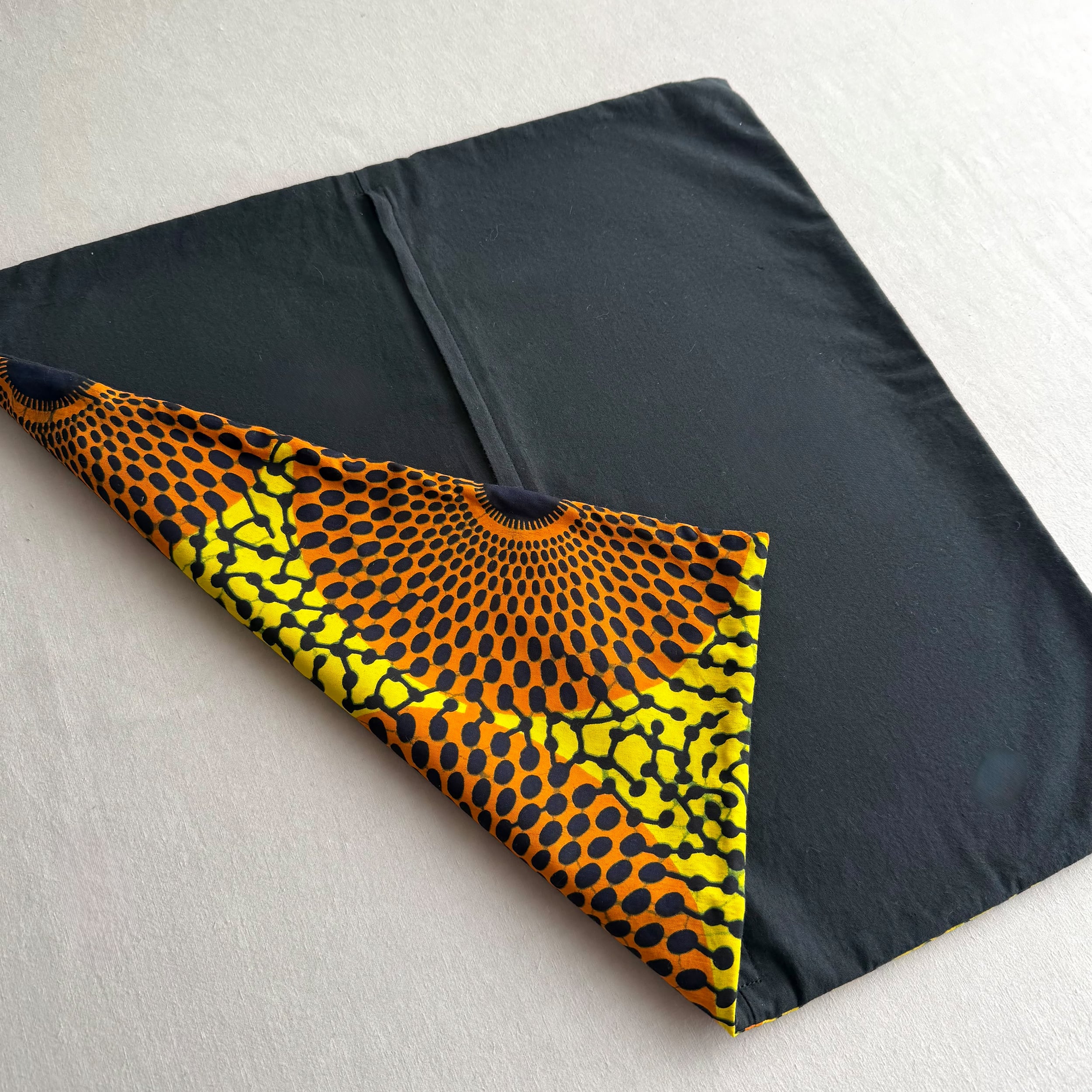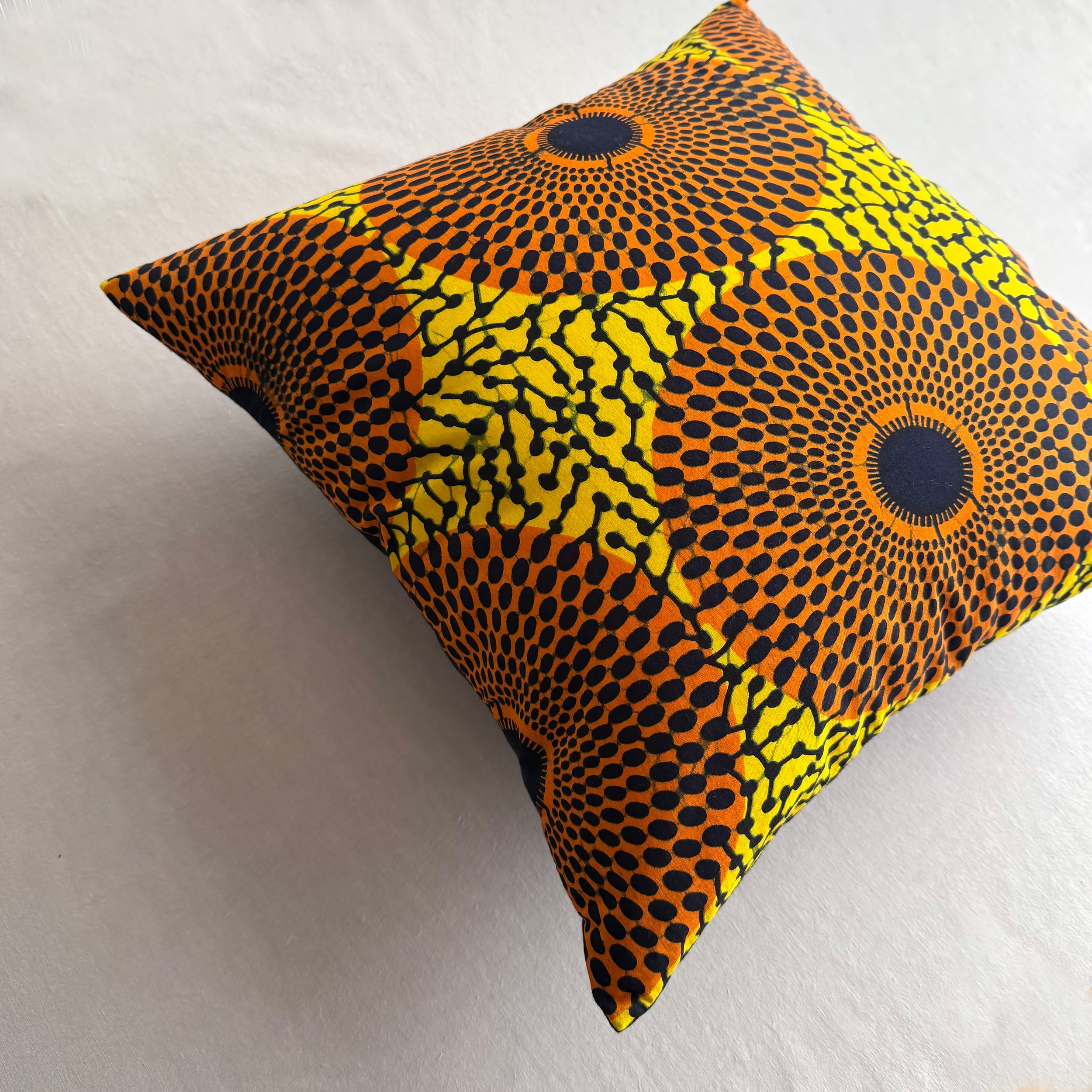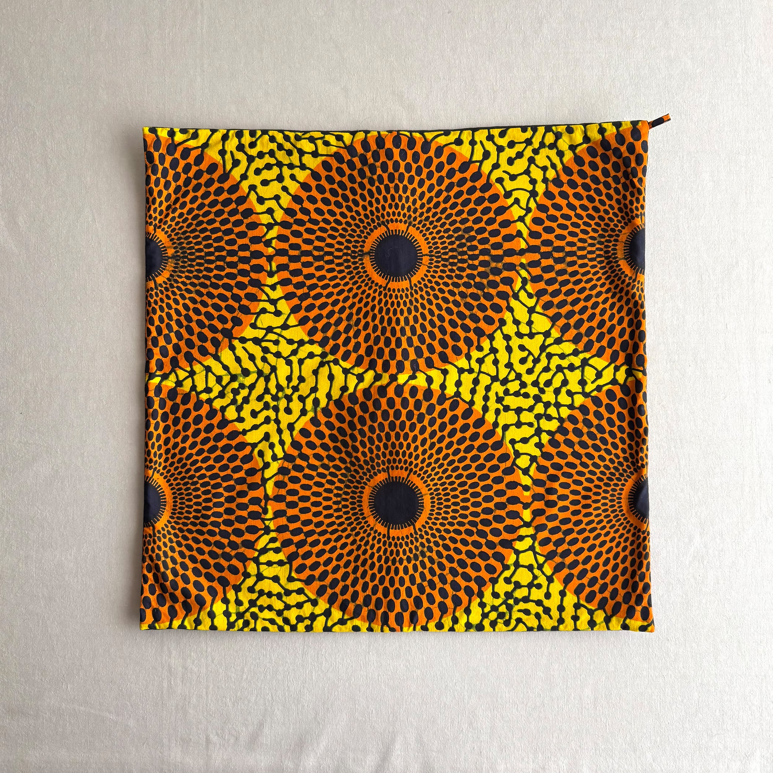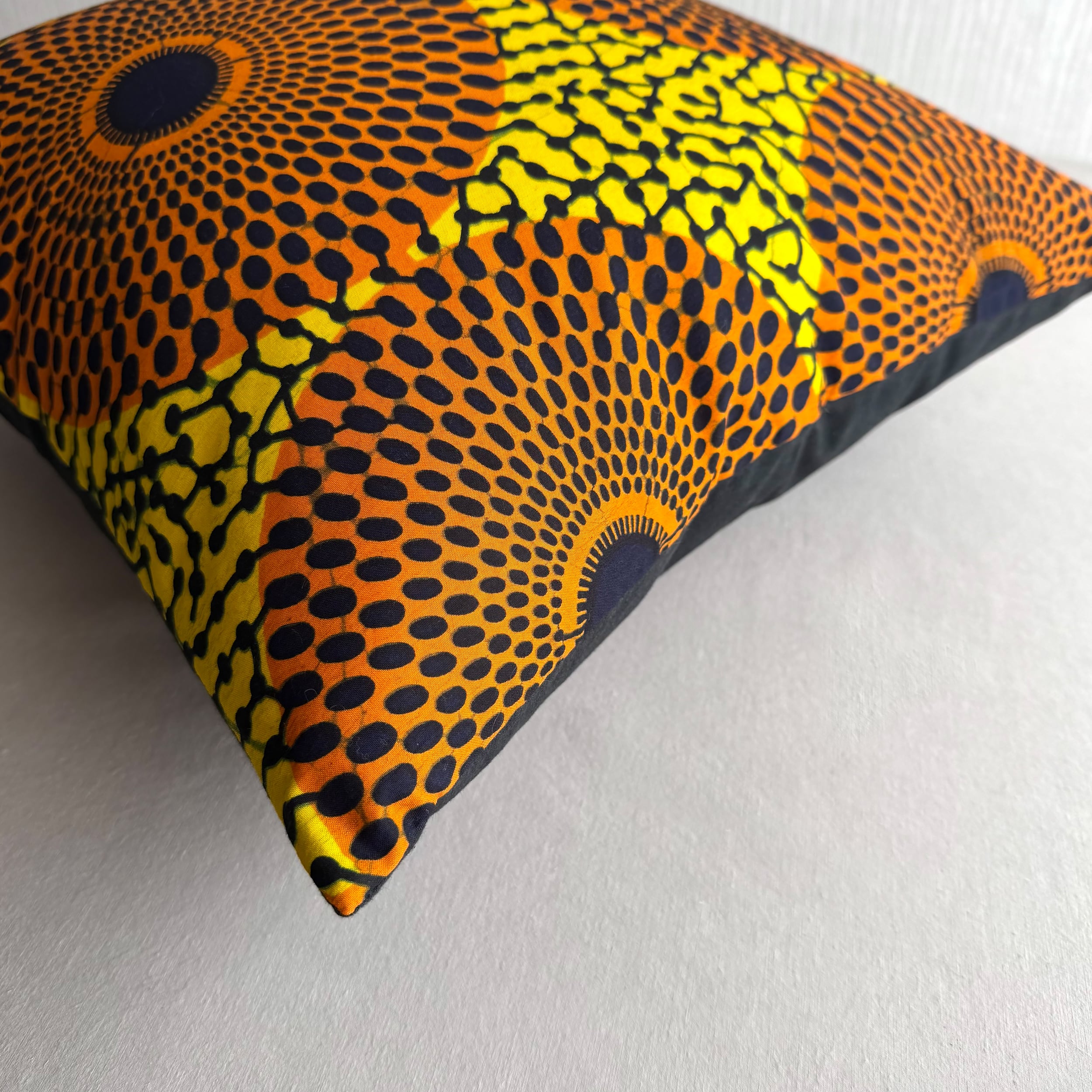 アフリカ布と無地の組み合わせでお作りしたクッションカバー。
