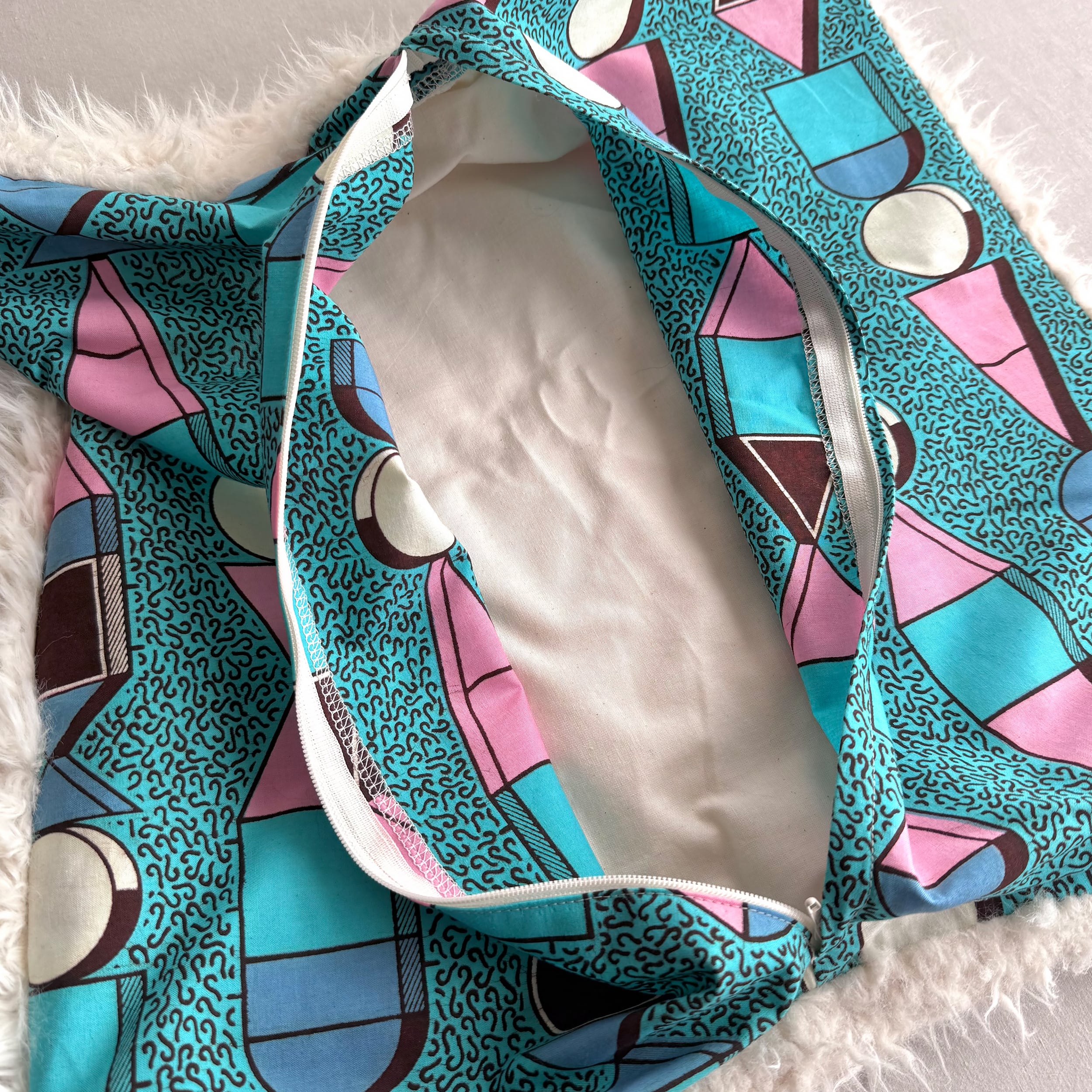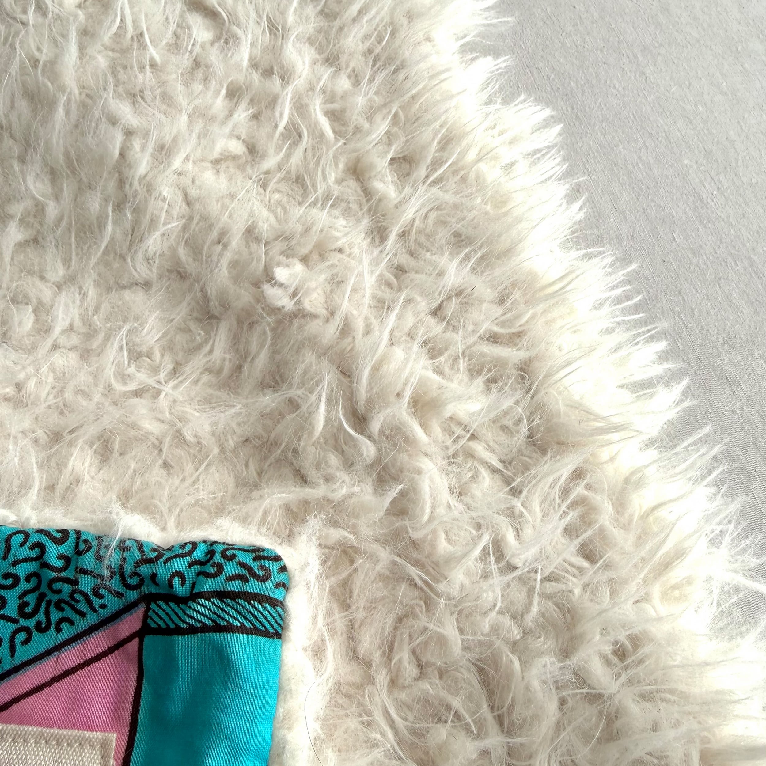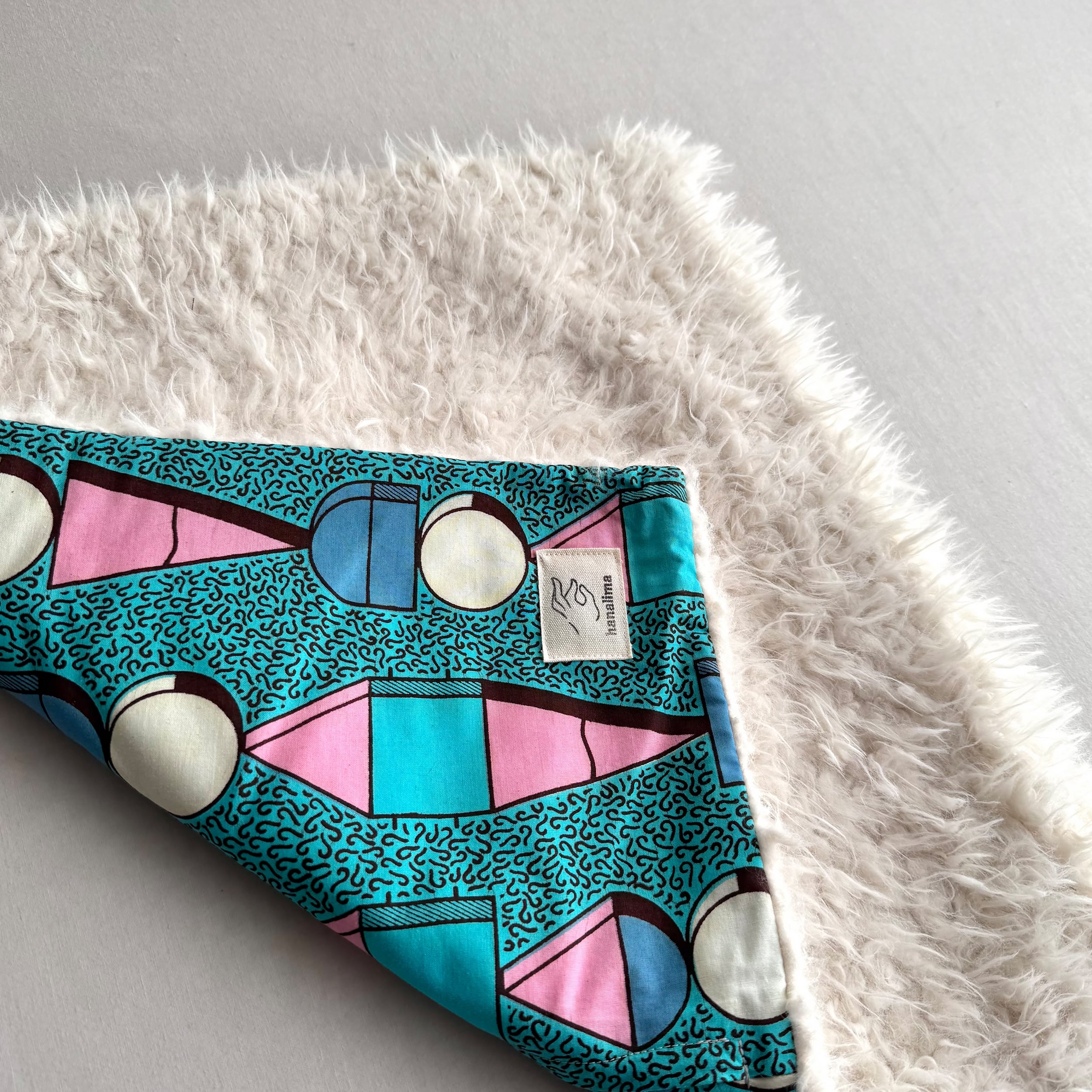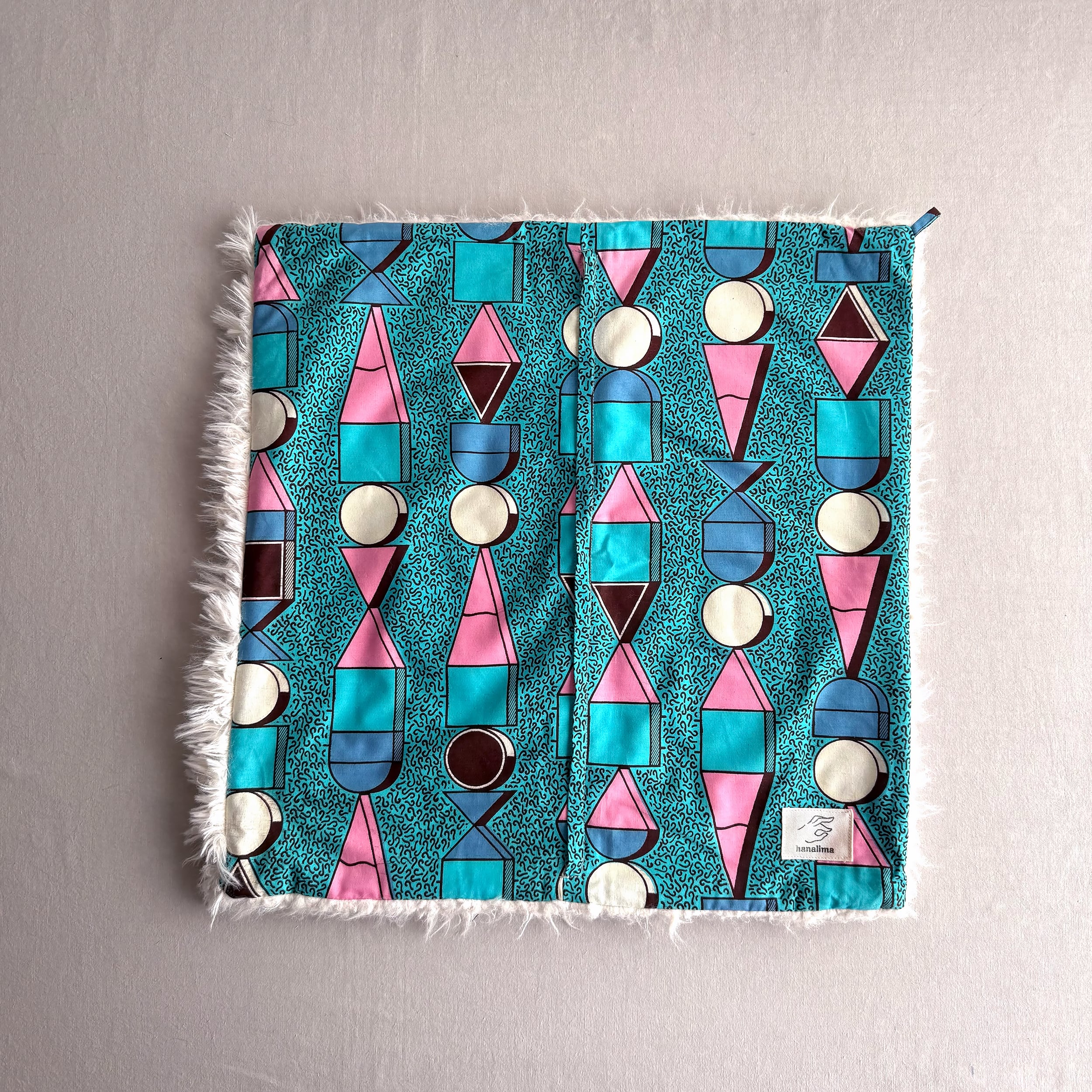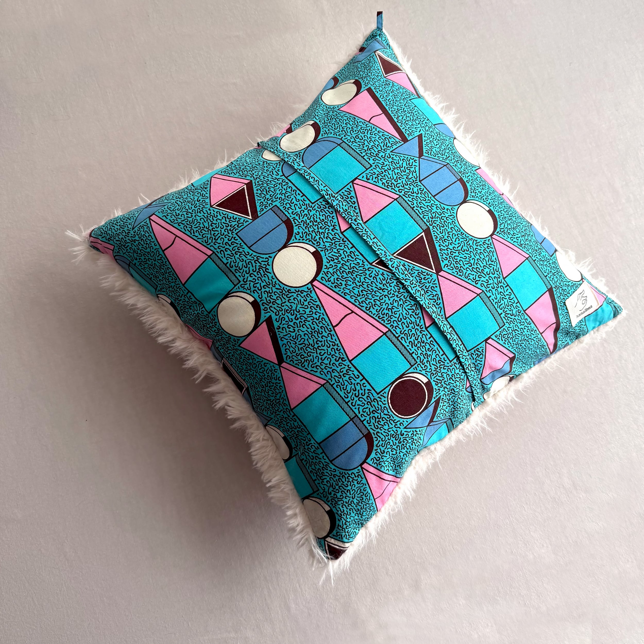 アフリカ布と独特な毛足のファー生地と組み合わせでお作りしたクッションカバー。